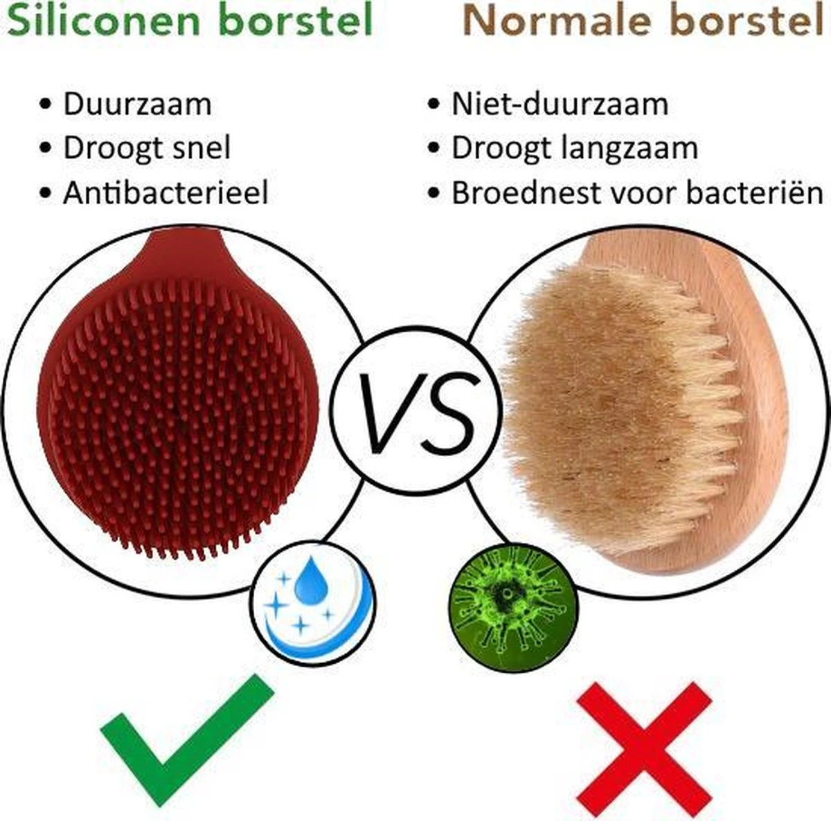 Het siliconen materiaal heeft vele voordelen. De fijne siliconen haartjes op de borstel zorgen dat uw huid niet wordt beschadigd, zo bent u verzekerd van een veilige bad- en/of douchebeurt. De scrubber is heel makkelijk schoon te houden door zijn rubberachtige eigenschap. De buigzaamheid van de borstel zorgt er namelijk voor dat het diepliggend vuil tussen de borstelharen makkelijk schoon te maken en te houden is. Wij gebruiken in tegenstelling tot vele concurrenten hoogwaardige kwaliteit siliconen, waardoor het product niet makkelijk afbreekt. De zachte, rubberen handgreep zorgt voor een comfortabele, maar goede grip. Verder is het door de lange steel erg makkelijk om onbereikbare plekken, zoals uw onderrug, te bereiken.