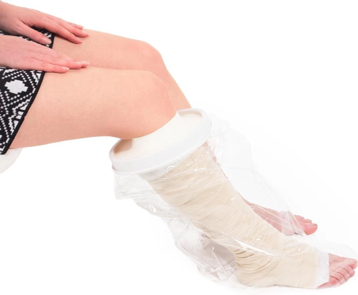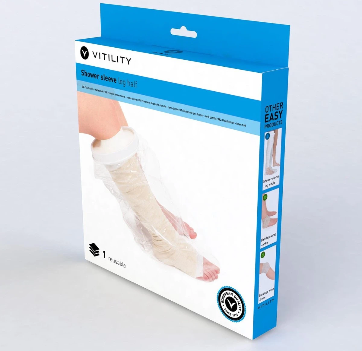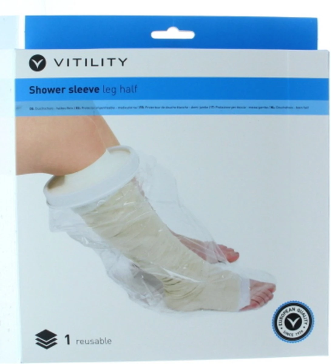 Douchehoes onderbeen De Vitility douchehoes voor het onderbeen is onmisbaar als je lekker wilt douchen terwijl je onderbeen in het gips of verband zit. De hoes beschermt het verband tegen nat worden; dankzij de elastische sluiting aan de bovenkant kan er geen water in de hoes lopen. Je hebt geen hulp nodig bij het aan- en uitdoen van de douchehoes, want dit gaat heel gemakkelijk.