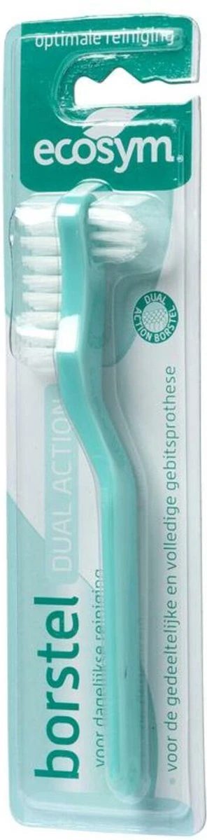 Ecosym Gebitsborstel is geschikt voor de dagelijkse grondige reiniging van volledige en gedeeltelijke gebitsprothesen. De gebitsborstel is eenvoudig te gebruiken in combinatie met Ecosym Dag Gel en zorgt voor een optimale reiniging. De voordelen van Ecosym Gebitsborstel: – Optimale reiniging van volledige of gedeeltelijke gebitsprothese – Schoon en glad resultaat – Het harde pluimpje komt ook in de kleinste holten en aan de binnenzijde – het langere handvat geeft meer grip op de borstel. Ecosym wordt aanbevolen door tandarts en tandtechnicus.