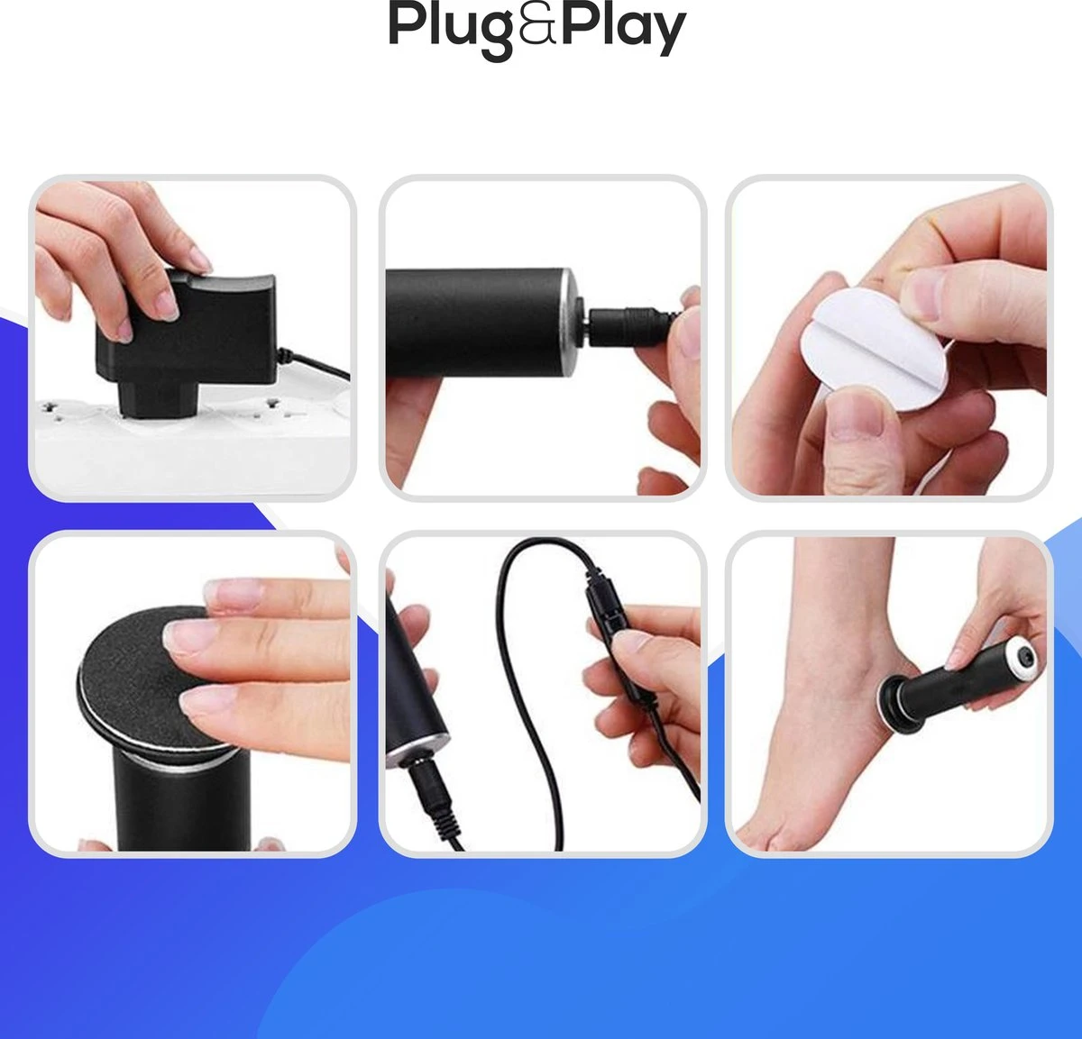 Je kunt de eeltverwijderaar direct bij ontvangst gebruiken, mede dankzij de netstroom adapter. Het enige wat je hoeft te doen om te beginnen met eelt verwijderen, is een schuurpad bevestigen op het ronddraaiend oppervlak, de kabel inpluggen in de eeltverwijderaar en de netstroom adapter in het stopcontact bevestigen. Doeltreffend, makkelijk en efficiënt!