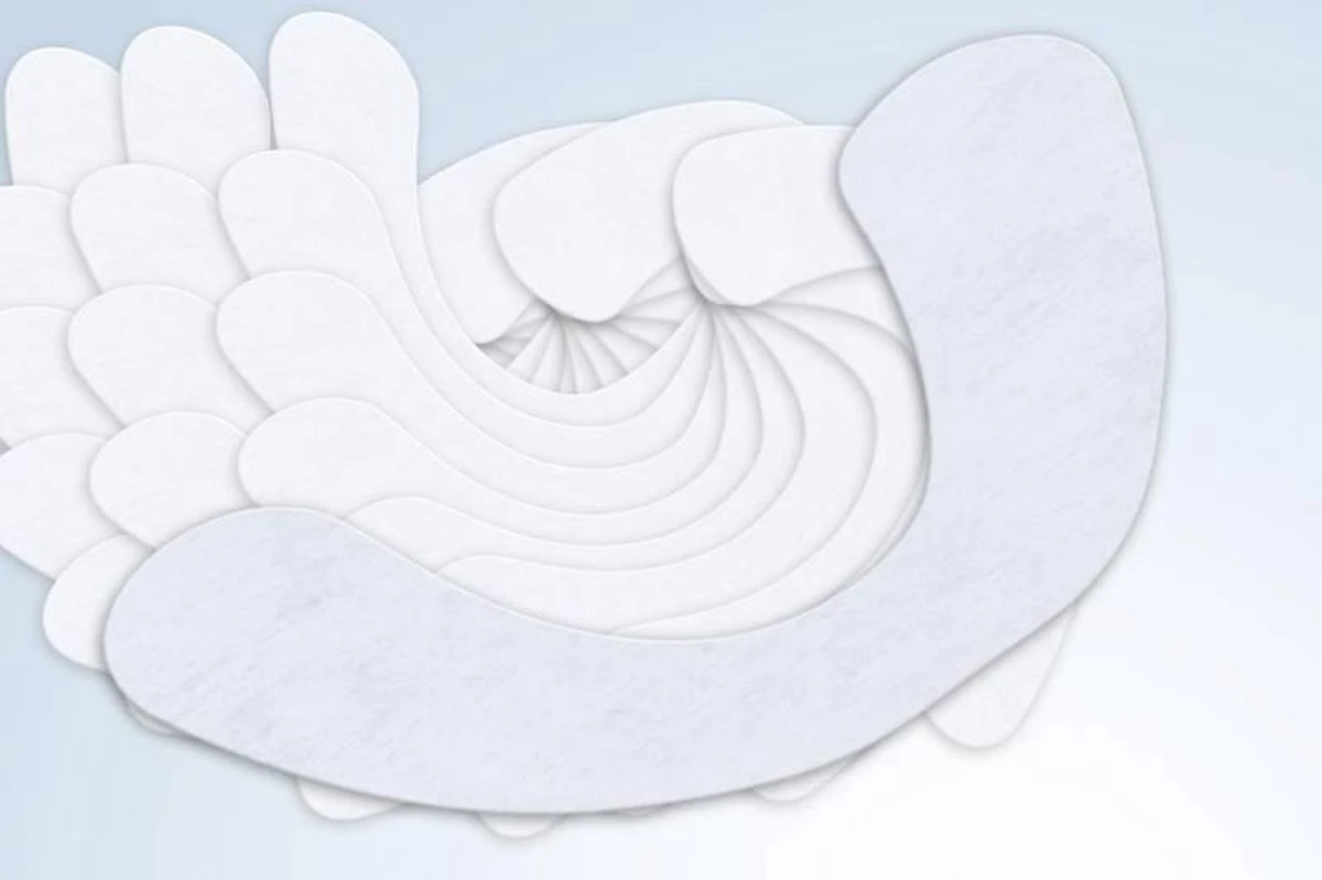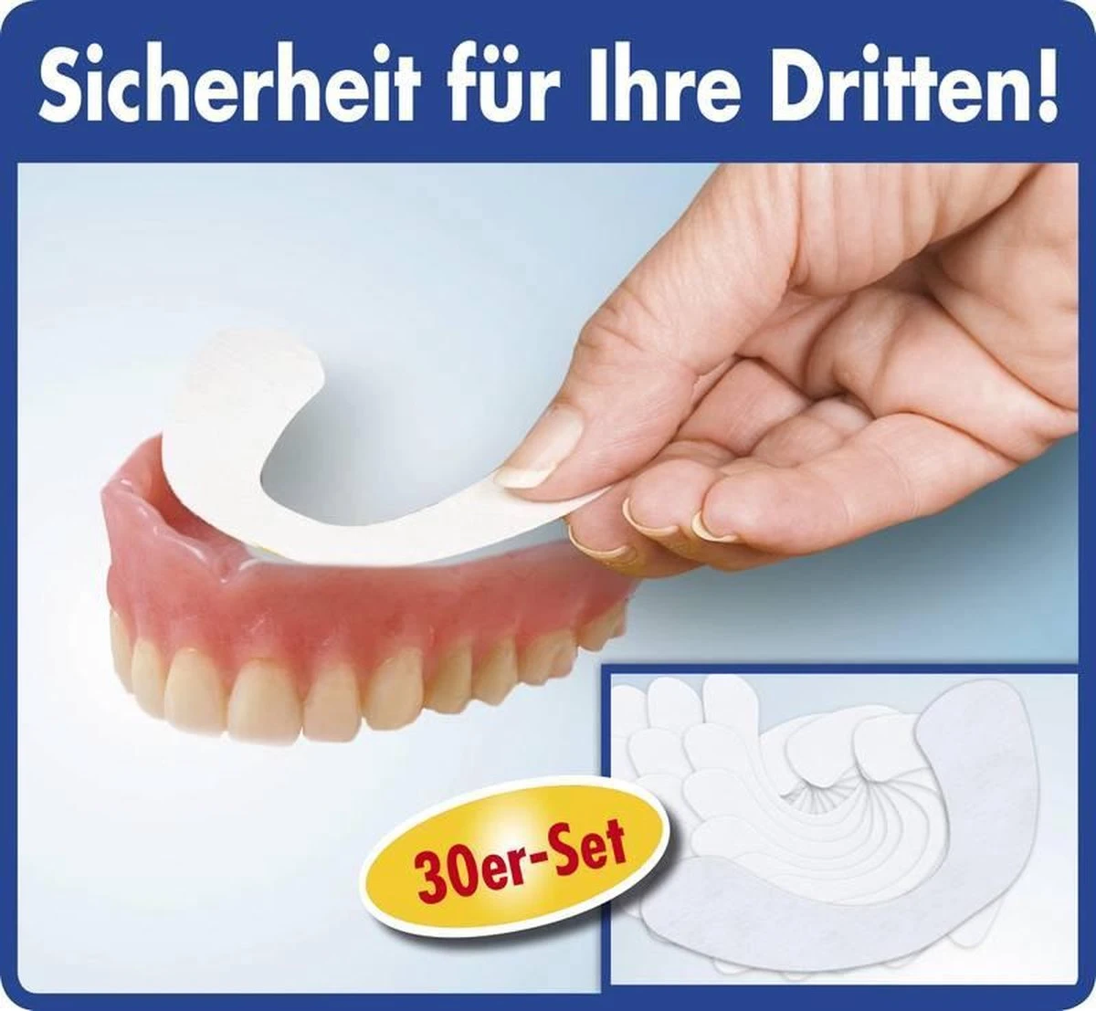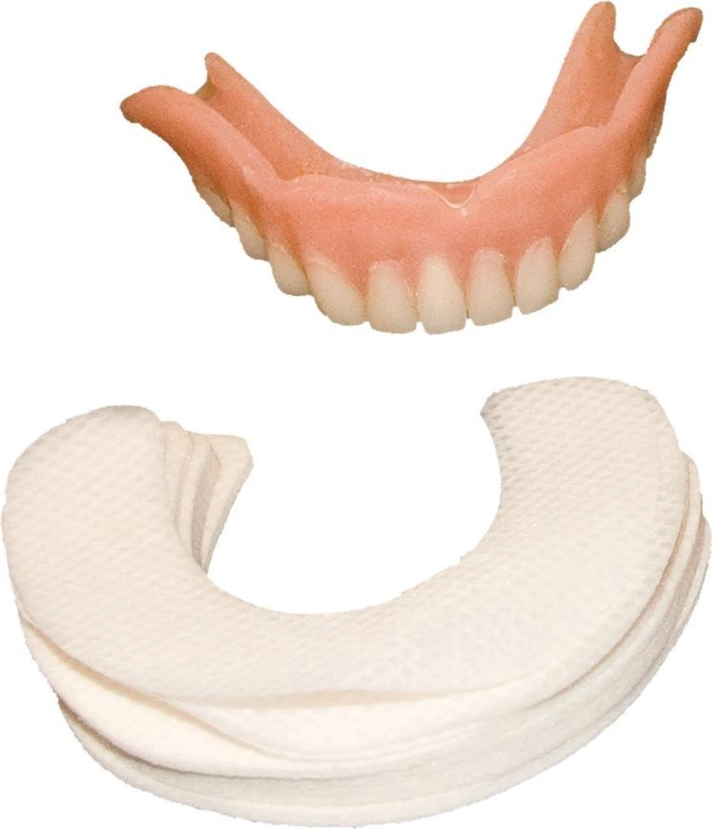 Zo’n kussentje bestaat uit vederlicht wafelachtig materiaal, dat zich onmiddellijk aan de gebitsplaat en de kaakranden met het gehemelte hecht. Bij ’t uitnemen laat het ook weer gemakkelijk los. Elk kussentje kan perfect op maat worden geknipt, geschikt voor elk boven- en ondergebit of deel-prothese.