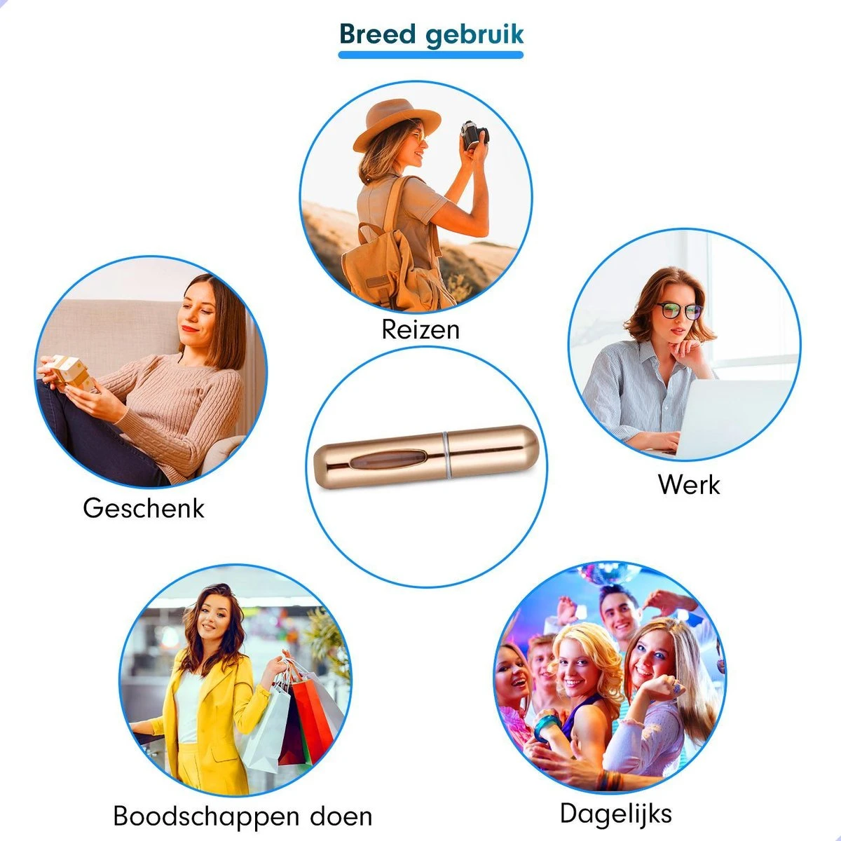 Dit kleine parfum flesje heeft de grootte van een lipstick, en past dus gemakkelijk in elke tas of zelfs broekzak!