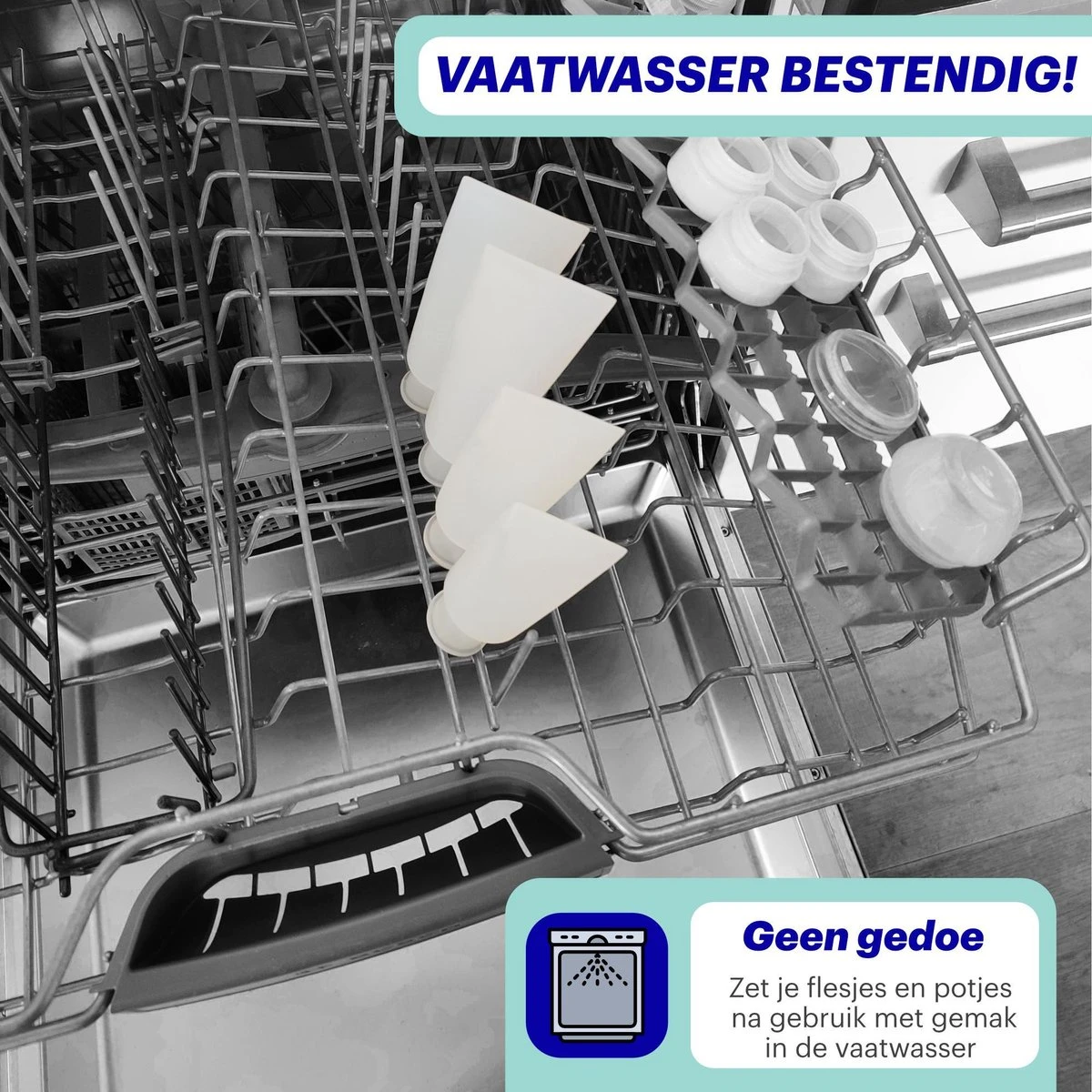 Wil jij jouw belangrijkste verzorgingsproducten mee kunnen nemen op een vakantie en je niet druk hoeven maken over eventuele ‘lekkage-problemen’? Kies dan voor deze BPA-vrije herbruikbare reisflesjes set incl. transparante etui uit de Qpacks collectie. Gemaakt van zacht siliconen, geschikt voor jouw crèmes en gemakkelijk schoon te maken!