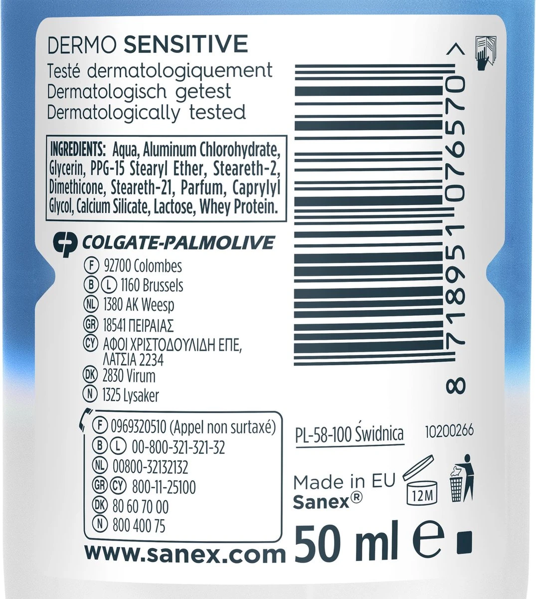 De dermatologisch geteste Sanex Dermo Sensitive Gevoelige Huid Deodorant Roller is speciaal ontwikkeld om de huid effectief te beschermen zonder te irriteren. De anti-transpirante deo beschermt gedurende 24 uur en bevat lactoserum dat mild is voor de huid. De formule is zorgvuldig ontwikkeld om jou en je huid het beste te kunnen beschermen. Sanex Dermo Sensitive Gevoelige Huid Deodorant Roller zal naast de langdurige en milde bescherming de transpiratiegeuren vervangen door een frisse geur. De crèmeachtige geur zal langdurig aanwezig blijven zodat je de hele dag door fris en lekker ruikt. Daarnaast is de Sanex Dermo Sensitive Deodorant Roller speciaal ontwikkeld om de gevoelige huidtypen te ondersteunen. De formule bevat lactoserum, een ingrediënt rijk aan melkproteïnen. Ook bevat de deo geen alcohol om het risico op irritaties te minimaliseren, en is het gericht om de natuurlijke pH waarde van je huid te herstellen.